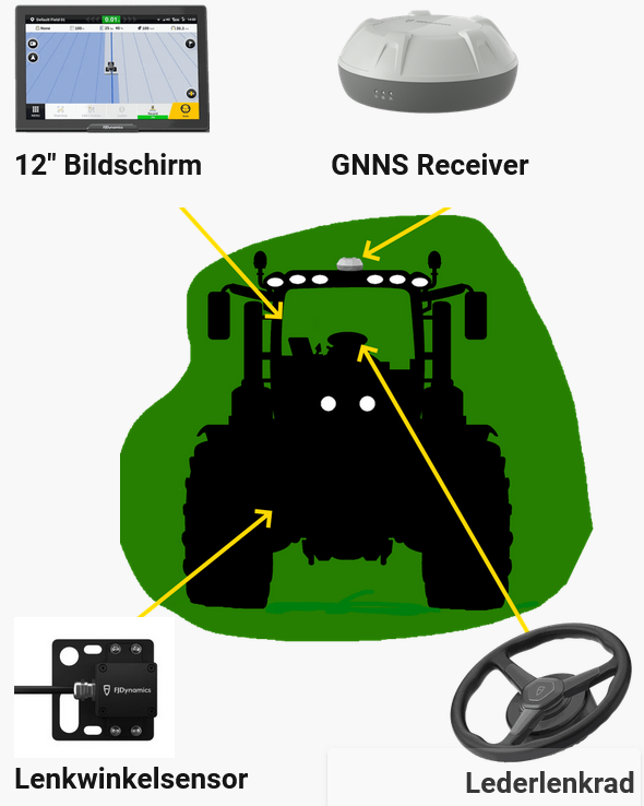 Der Einbau des Lenksystems in einen Traktor ist unkompliziert und kann von handwerklich versierten Anwendern selbst vorgenommen werden. Zu den Arbeitsschritten zählen der Austausch des Lenkrads, die Montage des GNSS-Empfängers auf dem Traktordach, die Befestigung des Terminals in der Fahrerkabine sowie die Installation eines Lenkwinkelsensors am vorderen Achsschenkel.